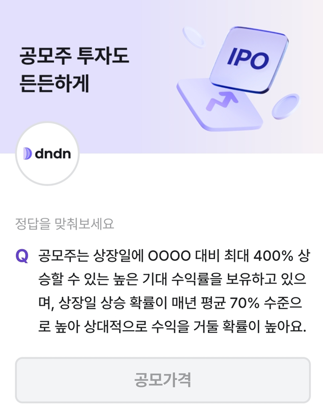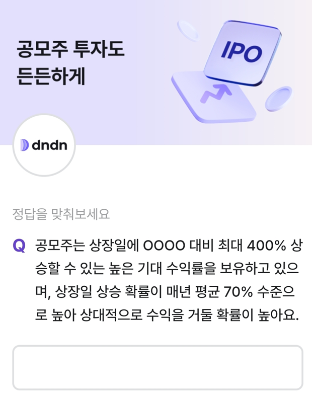 Home 카테고리 없음 비트버니 4월 12일 오늘의 퀴즈, 정답은? ㄱㅁㄱㄱ 비트버니 4월 12일 오늘의 퀴즈, 정답은? ㄱㅁㄱㄱ 찬스킹 2024. 4. 12. 비트버니 4월 12일 오늘의 퀴즈 문제 공모주는 상장일에 0000 대비 최대 400% 상 승할 수 있는 높은 기대 수익률을 보유하고 있으 며, 상장일 상승 확률이 매년 평균 70% 수준으 로 높아 상대적으로 수익을 거둘 확률이 높아요. 힌트 ㄱㅁㄱㄱ 정답 공모가격 정답을 맞추면 포인트를 줍니다. 반응형 공유하기 게시글 관리 배경 지식을 넓히자 댓글