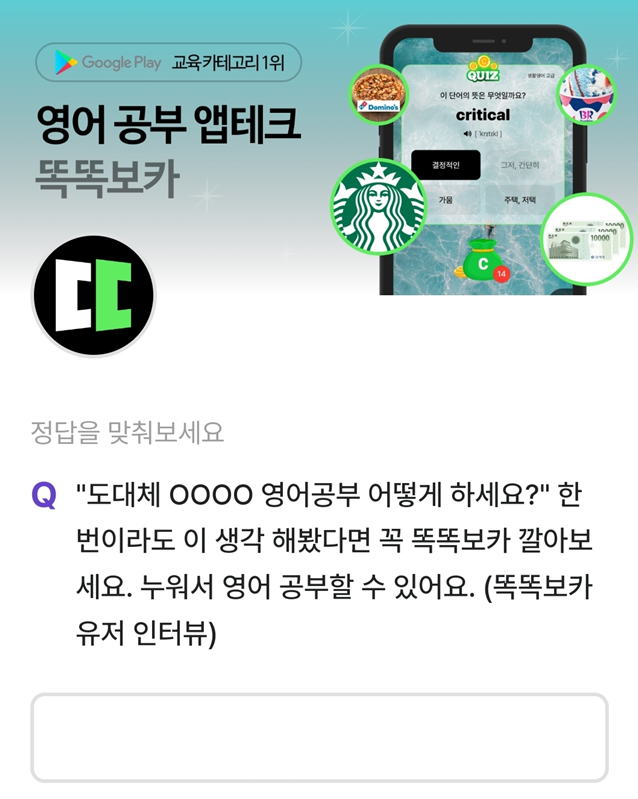 Home 카테고리 없음 비트버니 4월 15일 오늘의 퀴즈, 정답은? ㅌㄱㅎㄱ 비트버니 4월 15일 오늘의 퀴즈, 정답은? ㅌㄱㅎㄱ 찬스킹 2024. 4. 15. 비트버니 4월 15일 오늘의 퀴즈 문제 "도대체 0000 영어공부 어떻게 하세요?" 한 번이라도 이 생각 해봤다면 꼭 똑똑보카 깔아보 세요. 누워서 영어 공부할 수 있어요. (똑똑보카 유저 인터뷰) 힌트 ㅌㄱㅎㄱ 정답 퇴근하고 정답을 맞추면 포인트를 줍니다. 반응형 공유하기 게시글 관리 배경 지식을 넓히자 댓글