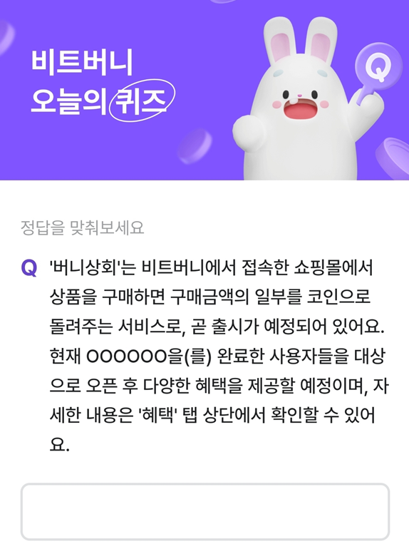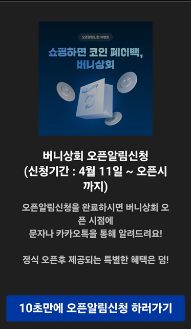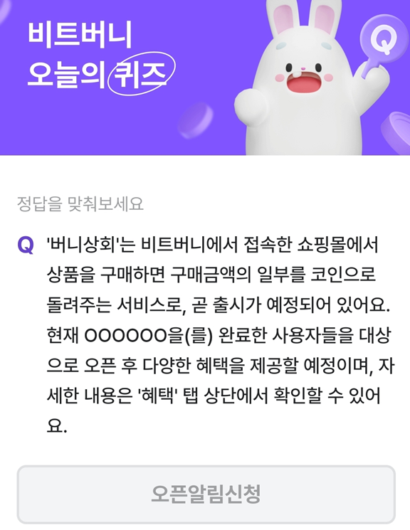 '버니상회'는 비트버니에서 접속한 쇼핑몰에서 상품을 구매하면 구매금액의 일부를 코인으로 돌려주는 서비스로, 곧 출시가 예정되어 있어요. 현재 000000을(를) 완료한 사용자들을 대상 으로 오픈 후 다양한 혜택을 제공할 예정이며, 자 세한 내용은 '혜택' 탭 상단에서 확인할 수 있어 요.