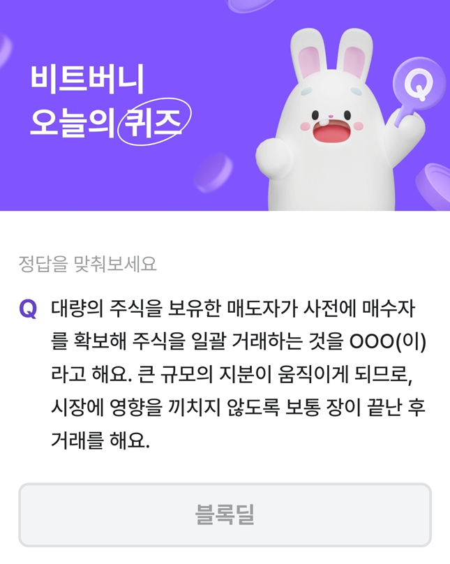 대량의 주식을 보유한 매도자가 사전에 매수자 를 확보해 주식을 일괄 거래하는 것을 000(이) 라고 해요. 큰 규모의 지분이 움직이게 되므로, 시장에 영향을 끼치지 않도록 보통 장이 끝난 후 거래를 해요.