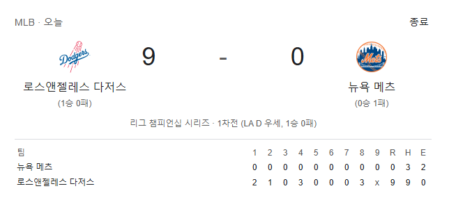 미국프로야구 메이저리그(MLB)에서 로스앤젤레스 다저스가 월드시리즈로 가는 길목에서 뉴욕 메츠를 상대로 기선을 제압했습니다. 다저스는 한국시간으로 14일, 캘리포니아주 로스앤젤레스에 위치한 다저스타디움에서 열린 2024 내셔널리그 챔피언십시리즈(NLCS) 1차전에서 메츠를 상대로 9-0이라는 압도적인 승리를 거뒀습니다.