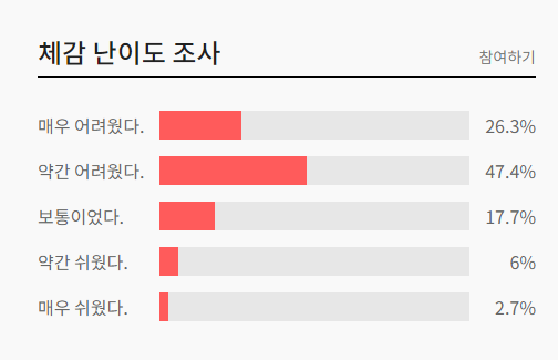 매우 어려웠다고 생각하는 학생이 26.3%, 약간 어려웠다고 생각하는 학생이 47.4%로 어려웠다고 생각하는 학생이 70%를 넘는 것으로 나타났습니다. 학생들의 변별력을 높이려는 문제가 많이 출제되어 킬러문항이 없어진 뒤로 문제의 난이도가 높아진 것으로 평가됩니다.